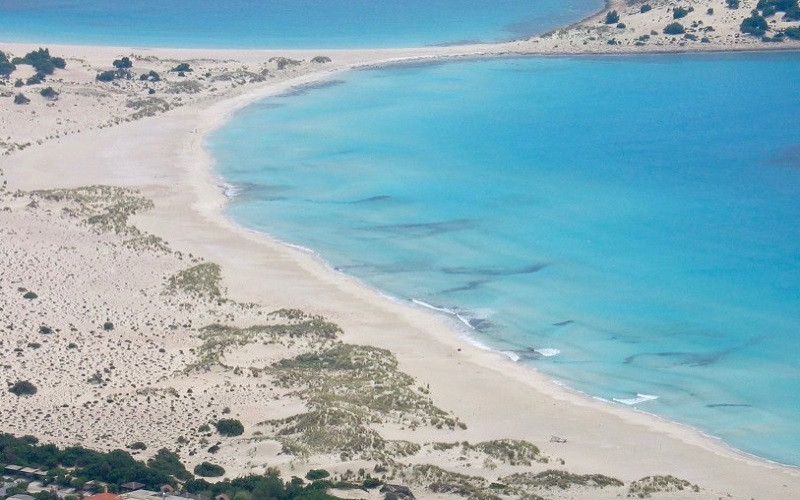 Simos is not only the best beach in the Peloponnese but also one of the top beaches in Greece. According to many, the best beach in Greece. You’ll probably have seen it in postcards long before you go, but the reality is far better than the pictures. Big dunes, mesmerizing emerald waters, endless white sand, a beautiful cedar forest…the setting is breathtaking! To reach this sandy paradise, you have to take the ferry from Vingliafa, a little village close to Neapolis town in southern Peloponnese.